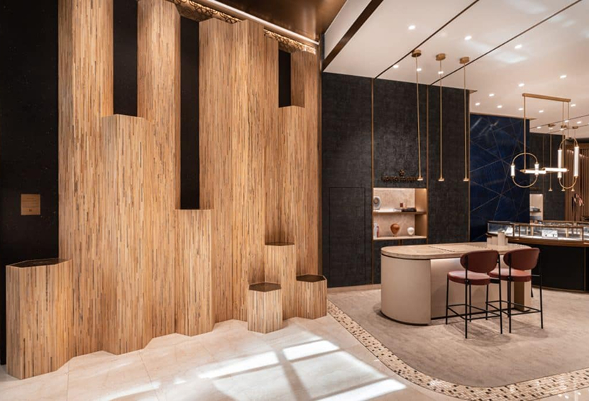 This installation draws inspiration from Arabic/Islamic architecture and the stately Palm tree, reflecting the ‘Less’ential’ theme of simplicity and impact. DATEFORM panels feature as elegant backdrops and display case bases, engraved with the Vacheron logo. It was also used to create bespoke gift boxes with metal inlays, all meticulously crafted by Kivara in the Emirates, showcasing our dedication to craftsmanship and innovation.